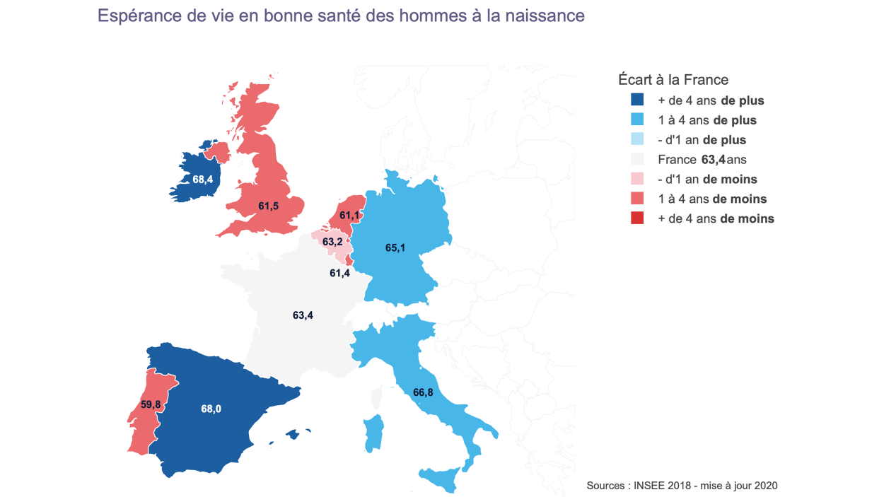 L’espérance de vie en bonne santé à la naissance en France se situe au niveau de la moyenne européenne (63,4%) mais reste bien en-deçà de nos voisins (entre 3 et 5 ans de moins qu’en Italie, en Espagne et en Irlande par exemple).