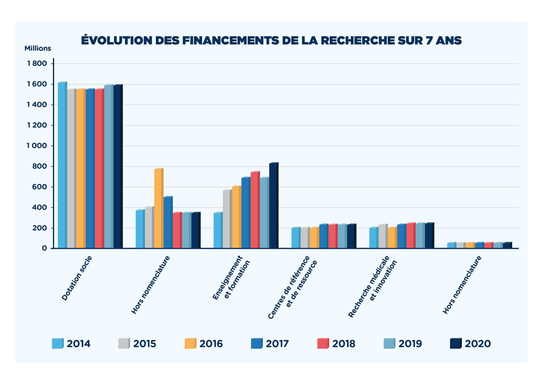 Une fois les effets dits de « périmètre » neutralisés, l’évolution de cette enveloppe recherche (« MERRI ») est en moyenne de 0.38% par entre 2014 et 2020, soit très en-deçà du rythme d’évolution des ressources de l’Assurance maladie. Un tel rythme d’évolution marque un sous-financement de la recherche.