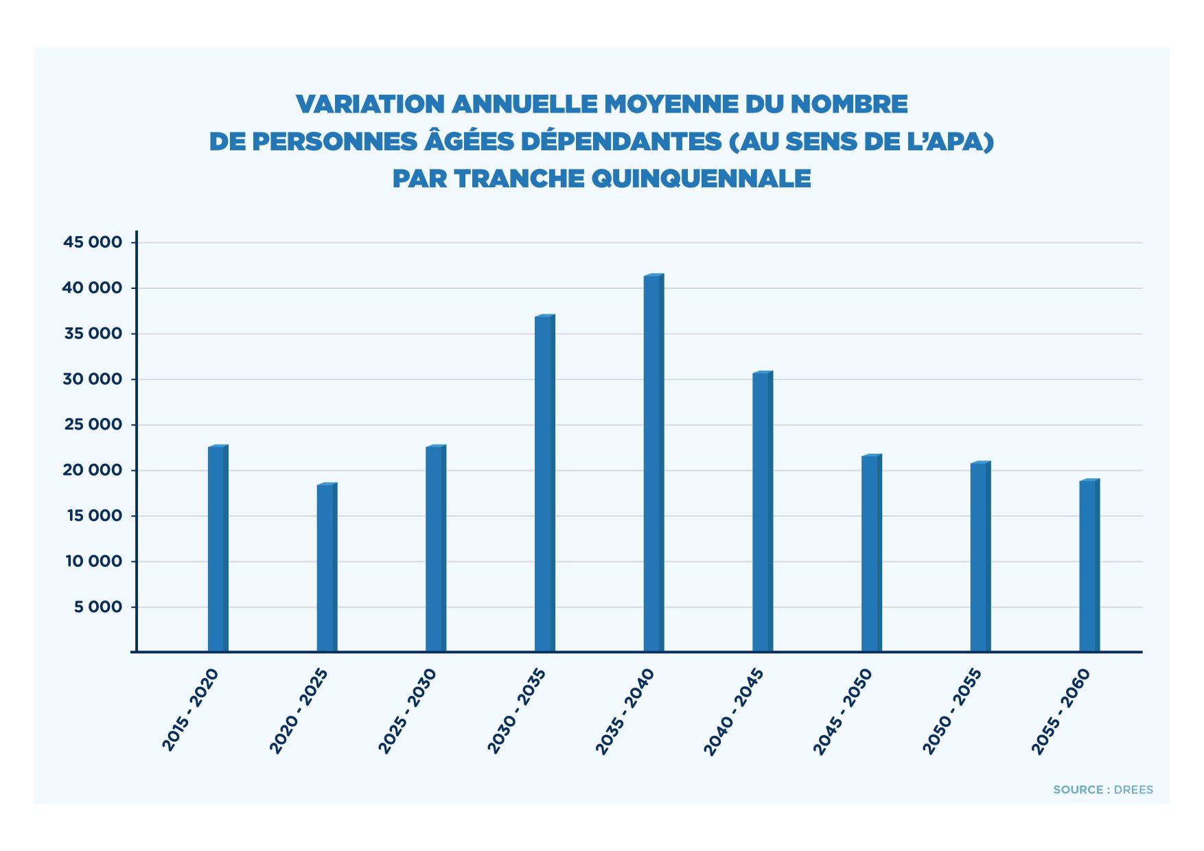 S’agissant des personnes âgées en situation de perte d’autonomie, les projections divergent selon les hypothèses (notamment les progrès de la médecine ou l’efficacité des actions de prévention) mais les différentes fourchettes conduisent à retenir une hausse de 200 000 à 400 000 personnes âgées en situation de perte d’autonomie à l’horizon 2030 (soit environ + 20 000 / an) et une progression plus forte encore dans la décennie 2030 – 2040 (jusqu’à + 40 000 / an).